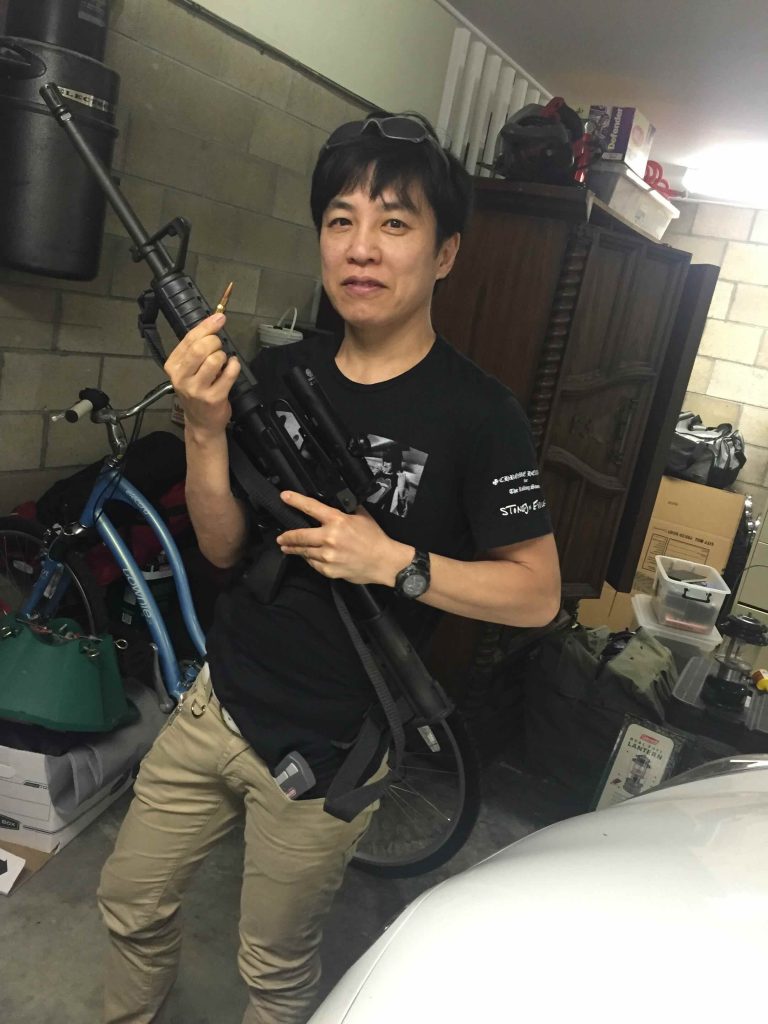 2016年春、ハワイ友人宅ガレージ内で、友人所有の自動小銃(M-16)とその弾丸を構えて。