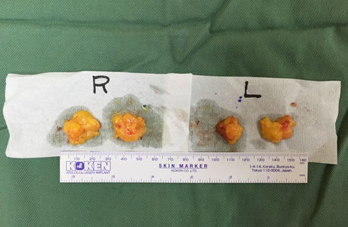 摘出脂肪は写真の如く左右で2つに区分していますが、それは脂肪塊(バッカルファット)の過剰摘出部位が"本体"と"延長部"の2部位から構成されているからです。