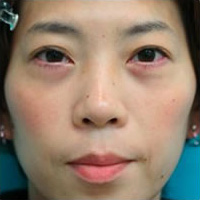 治療前のカウンセリングで、本人は「目が乾燥するのだが、これ以上“あっかんべー”の状態にならないか?」と言う疑問を持っておられました。しかし、この治療を行なうと、写真3、4からわかるように、むしろ目の下の皮膚に余裕が出来るので、“あっかんべー”の改善効果があります。