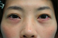 4年前、他院で行なわれた目の下のたるみ切開治療の後、写真1、2からわかるように、両下瞼の外反、いわゆる“あかんべー”をやや認めます。その傾向は特に左目で強いようです。