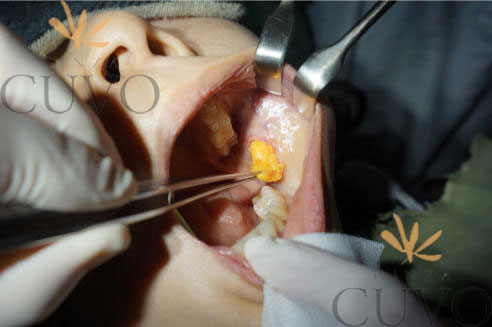 治療中の写真-9,10(左右バッカルファット摘出時)で示されるように、バッカルファットは口腔内前庭部に開口部を形成すると、私が無理に摘出しなくてもバッカルファット自ら逸流し始めます。つまりこの脂肪塊は可動性(動くこと)を有しており、立位では口角下部に下垂しており、それが顔面のたるみの主要因であることは明らかです。