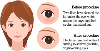 Bags under the eyes have been shown to be caused by the relaxing of the support tissue around the eyes accompanying aging. So if there are bags under the eyes, it is recognized by others as a typical sign of aging and causes a serious inferiority complex in the individual. Conventionally this problem was generally addressed by removing skin from directly underneath the lower eyelid eyelashes. But cutting away skin poses the risk of aftereffects, such as leaving a mark (scar) and excessive removal of the skin can cause the lower eyelid to turn outward (the so-called "bleah insult" look). This is the reason that lower eyelid skin removal surgery is said to be one of the most difficult of the aesthetic plastic surgeries.