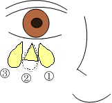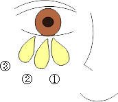 The lower eyelid fat is formed of 3 bunches of fat. Wrinkles or sinking could occur when the treatment is performed by an inexperienced doctor when the fat is not unevenly removed from (1), (2), and (3). When the treatment is actually performed, the fat is easiest to remove from (2), so an inexperienced doctor will tend to only remove the fat from (2).