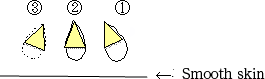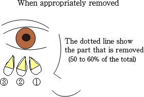 If the doctor has the experience and skill to evenly remove the necessary amount of fat (50 to 60%) from (1), (2), and (3), the problem will not reoccur and wrinkles and sinking will not form. When the fat is correctly removed from (1), it is possible to create an attractive so-called "tear bag." Removing the outside fat of (3) first to give priority to reducing the weight applied to the inside makes it possible to just reduce the minimum amount of the fat from (3) to create a good effect without wrinkling or sinking.