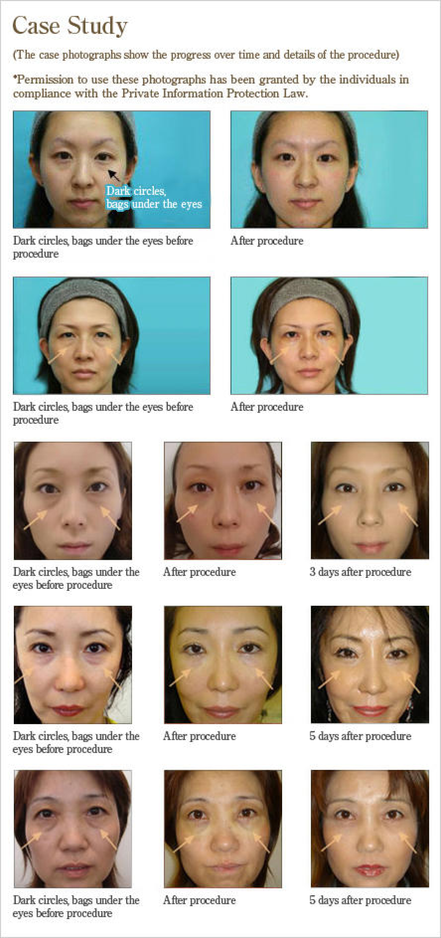 From the time Ginza CUVO opened until today (as of October 2011), Dr. Kubo has handled over 6,000 cases by conducting all of the counseling, procedures, and follow-up himself. The result of this extensive treatment experience is Dr. Kubo being one of the few physicians that can safely and surely perform lower eyelid surgery, which is said to be one of the most difficult procedures in the field of aesthetic plastic surgery. This is one of the major distinguishing features of the Ginza CUVO. Following are some typical cases of treatment for bags under the eyes from when the clinic first opened in 2005. Some of the clients had received counseling for bags under their eyes from other clinics.