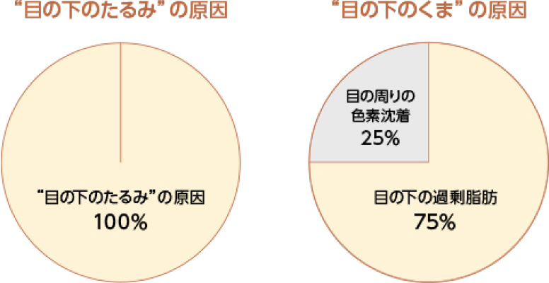 女性の場合、下眼窩脂肪量は比較的少量ですが、男性よりも眼窩脂肪支持組織はもろいので、男性のケースよりも若く(20代後半)から目の下のたるみが出現する場合も少なくありません。