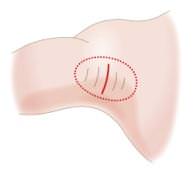 治療は上段左イラストの如く両上肢を挙上させ、腋窩のしわに沿って、4cmほどの切開を加えます。(上段右イラスト)
