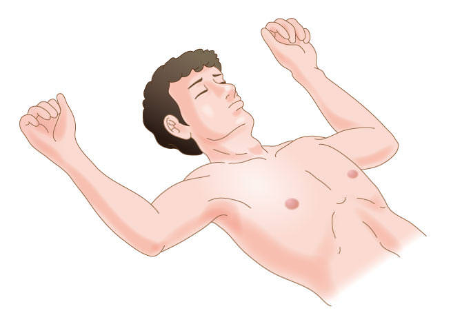 診察と治療はイラストの如く、患者さんを仰臥位、両手を挙上させて行います。