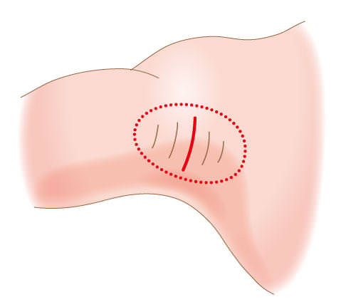 組織削除法(手術) 腋下の皮膚を3ー4cmカットし,皮膚を裏返しはさみで少しずつ切り取っていく方法です。直接目で確認し汗腺を取り除いていくため、最も高い効果があります。 確実に汗腺の除去ができれば、再発の心配もありません。傷もしわに沿っているためほとんど目立たなくなります。脱毛効果もあり最も根治の可能性が高い治療法です。