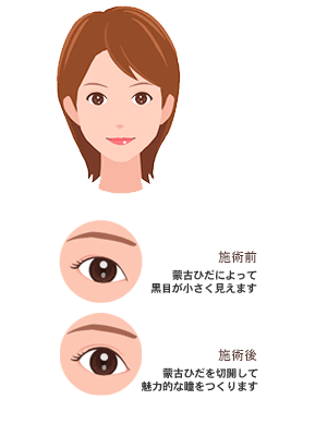西洋人はこのヒダがないため、目が大きく見えるのです。この目の内側にある蒙古ひだを切開することで、本来持っている美しい瞳を最大限に露出させることが出来ます。