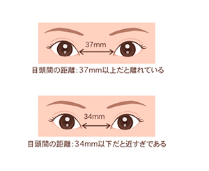 美しい顔のバランスを考えたとき、左右の目の距離は三等分されます。目の大きさは人によって個人差もありますが、目の幅の距離をはかると平均すると [ 目の幅の距離の平均は、の方が良い ] 約34ミリとされています。従って、目と目の間の距離も34ミリが平均的です。