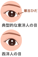東洋人の目頭は目の外側から内側に向かって、ヒダ状の組織が張り出しています。このヒダはいわゆる蒙古ひだと言われるもので、我々日本人にも特徴的に見られるものです。このヒダが張り出していると、上まぶたが瞳にかかって、やや目が小さく見えてしまいます。