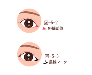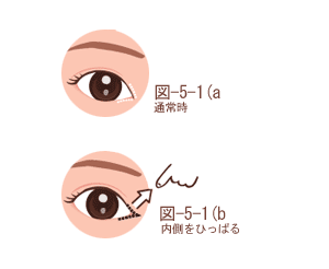 内側を矢印方向に引っぱると黒いドット線で示されるように上まぶたのライン状におさまる。 (図5-1-(b
