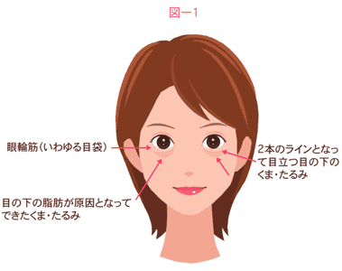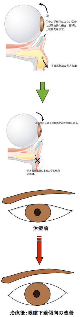 眼瞼周囲は目の繊細な動きに対応出来るよう、大変繊細な構造を有しています。したがって、眼球支持組織も同様に繊細で、加齢に伴う支持組織の弛緩により下眼瞼脂肪組織が前方突出します。我々東洋人には下眼瞼脂肪組織が多く、そういった方々は、加齢とともに目の下のたるみを顕著に認めるようになります。
