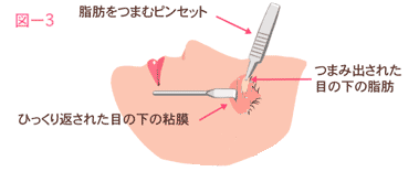 (1)、(2)、(3)それぞれから、必要量(5~6割)を均一に取り出す経験・技術があれば、元に戻ったり、しわ、くぼみが出来ることはありません。(1)の脂肪を適切に除去すると、魅力的ないわゆる”涙袋”を作ることが可能です。(3)の外側脂肪から最初に除去し、内側への加重を減らすことを最優先に行うと、(3)の脂肪は最小限のみの除去で良いので、しわやくぼみのない良好な結果が得られます。