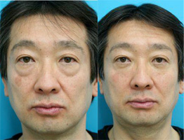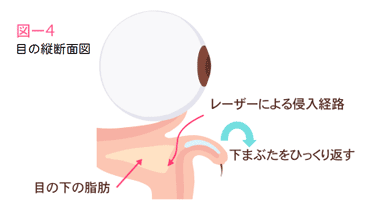 最後に目の裏側からの治療では元に戻るか?この質問にお答えいたします。下眼瞼脂肪の前方突出部(全体の6割程度)を摘出し、その切除部位をレーザー処理しますと、再発は起こりません。過去7年間の過去症例を分析すると、適切な治療が行われた症例では、何年経過しても症状の再発がないことが実証されています。