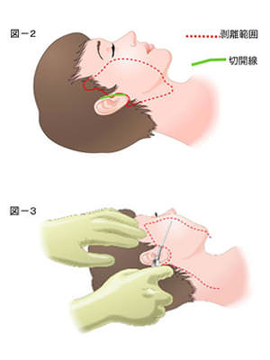 皮下組織の剥離が終了すると、図-5のように皮膚をリフトアップし、余分な皮膚を切除した後、縫合して治療を終了します。