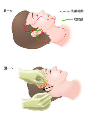 次に通常のフェイスリフトについて説明します。 通常のフェイスリフトは比較的年齢層が高く、たるみの程度が大きい方が適応となります。 図-4で示されるように、通常のフェイスリフトはミニフェイスリフトに比べると、切開線がやや延長されます。