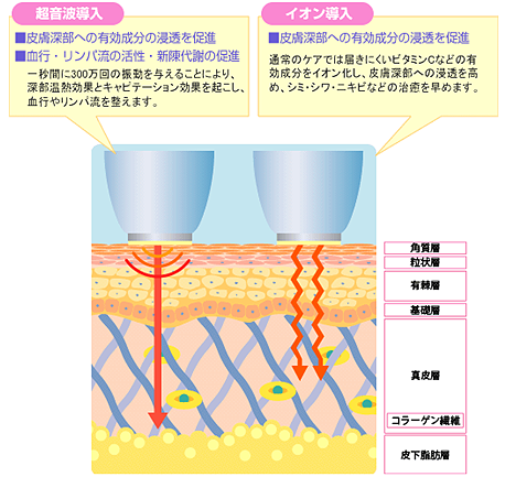現在、海外において注目されている作用で、ソノフォレーシスと呼ばれています。ソノフォレーシスとは具体的には1秒間に300万回の超音波振動を皮膚に与える事で角質層のバリアにキャビテーション現象(空洞形成)を起こし、その空洞内に物質を移動させることを言います。そうすることで比較的大きな分子量のものでも浸透しやすくなります。代表例として、シミやニキビに有効的なビタミンAは電流を通しても分子が小さくならない為、イオン導入では肌深部までの浸透は難しいですが超音波導入であれば浸透させる事ができます。ソノフォレーシスを使用すると、有効成分の浸透はただ塗るだけより、約40〜100倍高まることが分かってきています。