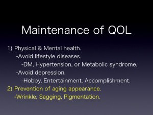 良質なQOLを維持するには心身を健全に保つことが肝心ですが、そのためにはメタボリック症候群、糖尿病、高血圧等の生活習慣病に罹患しないように注意すべきです。正しい食習慣や規則正しい生活、適度な運動を日々の生活に取り入れることが、生活習慣病予防に欠かせないことは言うまでもありません。 さらに心の健康も良好に保つことが体の健康と同様に非常に重要です。中高年層で気をつけるべき点はうつ病にかからないことです。うつ病は心因性、つまり心の状態に原因がある場合が多く、その原因を取り除くことで軽減させることが可能です。また、趣味や生き甲斐を持ったり、仕事に充実感や達成感を持つことでうつ病の発生を抑えることが可能です。 次に中高年層世代は加齢に伴い、しわ、しみ、たるみ等が発生します。こういった加齢性変化は我々自身のコンプレックスとなり、希望の喪失感、ネガティブ思考の原因となりかねません。 美容外科領域ではこういった加齢に伴う外見上のコンプレックスを解消します。