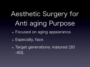 アンチエイジングのための美容外科では老化兆候の解消を目的にします。 治療対象は顔中心となります。その理由は顔以外の体部は運動により筋肉を維持すること、さらに正しいダイエット習慣で肥満を予防することが何よりの老化予防となり、美容外科的治療の対象とはなりえないことが多いからです。 治療を受ける年齢対象は30〜60代ですが、今後高齢化が進むにつれ、70代の患者さんが増加する可能性が考えられます。