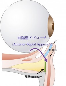 手術は仰臥位にて鎮静剤(セルシン10mg)を静注し、沈静化をはかった上で局所麻酔として下眼瞼に1%キシロカイン(10万分の1アドレナリン)を片側3〜6mlを注入し、麻酔が効力を発揮するまで5分程度経過してから治療を行った。下眼瞼粘膜の進入は高周波レーザーメス(エレマン社)を用い、出力27J にて水平方向に割を入れ、下眼瞼遠位端に向かって剥離を行った。進入はFig-2の如く、隔膜前方アプローチ法を用いた。