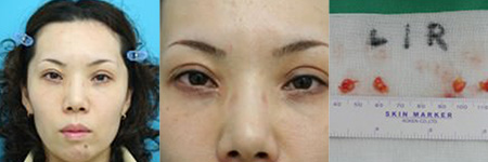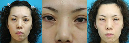 One week after the operation. Swelling of lower eyelid was mostly subsided. However, chronic swelling of orbicularis oculi muscle still remains.