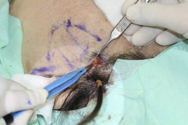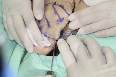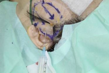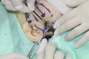 2.皮膚剥離部には0.2~0.25%キシロカイン局所麻酔剤を均一に注入することで皮下脂肪組織を膨らませる。この局所麻酔注入法はチュメセンス法と呼ばれ、剥離面の同定及び剥離を容易にする。