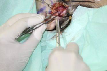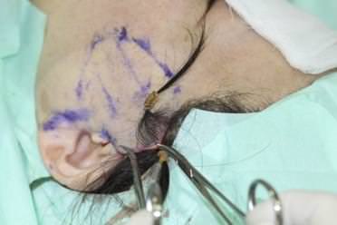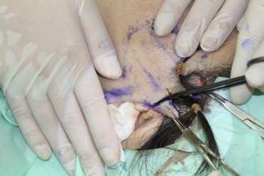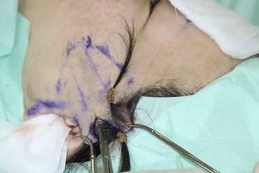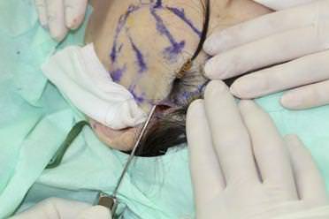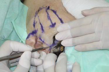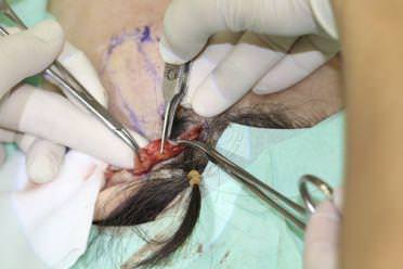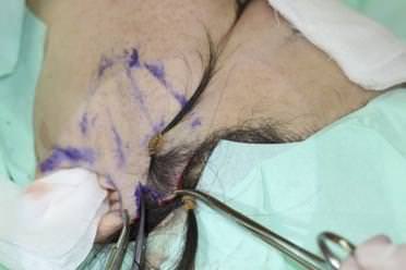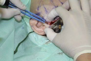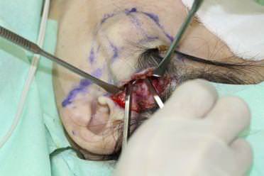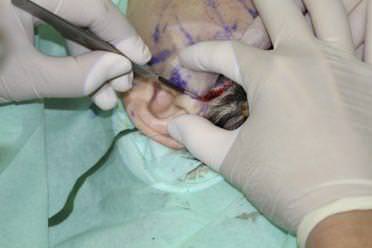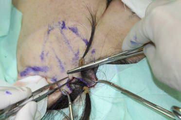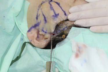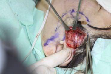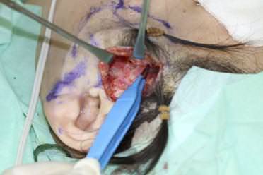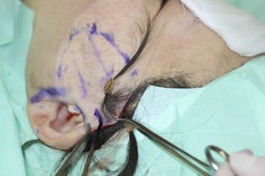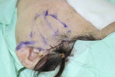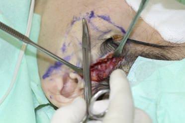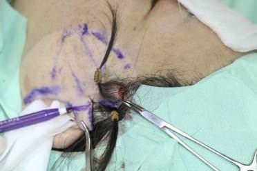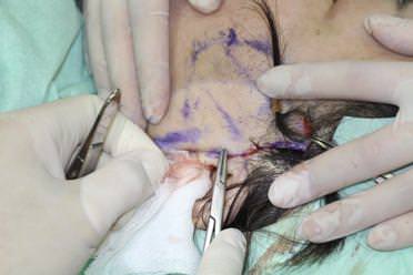 5.皮下脂肪層での剥離・脂肪吸引終了後に、カニューラ進入口部位から皮膚切開を行う。同部位には浅側頭静脈が縦走するので、切開創は最初出来るだけ浅く行い、確実な止血操作を行いながら、少しずつ切開創を広げる。