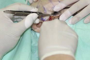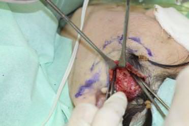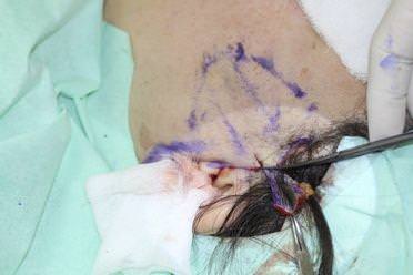 7.長径鋏を皮膚上に置き、先端到達点位置を確認する。次にこの鋏を皮下層に挿入し、先ほど皮膚上の確認位置まで剥離が到達したことを確認する。