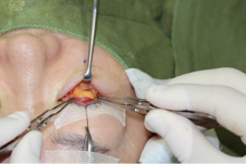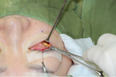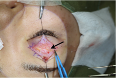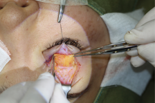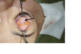 上眼窩は図-3で示されるように、皮膚直下に眼輪筋、そして眼輪筋直下には眼窩隔膜(Septum)が存在する。また図-6は眼輪筋を切離し、眼窩隔膜に達した所である。眼窩隔膜は矢印で示された白い膜状組織でその下に上眼窩脂肪を包み込む。また図-7は皮膚切開法を用いた上眼瞼形成術を施行した際に上眼窩脂肪を展開したところであるが、上眼窩脂肪に到達するには眼輪筋とこの脂肪の境界をなす眼窩隔膜を切離する必要がある。上眼窩脂肪は中央、外側部は比較的発達しているが、内側部はさほど発達していないことが多い。図-8では横走靱帯を認める。眼瞼挙筋は横走靱帯を滑車に上眼瞼を開眼させる。