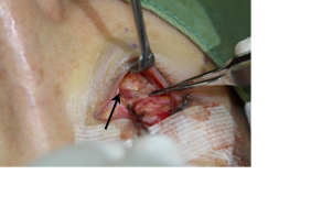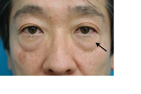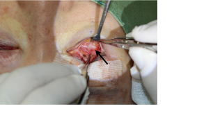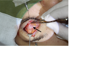 赤色で示された組織は外眼筋の一部であり、上眼瞼では上直筋、下眼瞼では下直筋と呼ばれる。これらの筋肉は眼球運動機能に関与しており、上直筋は眼球上転運動、下直筋は眼球下転運動を司る。外眼筋にはこれら以外にも内側直筋、外側直筋、上斜筋、下斜筋と全部で6個の筋肉から構成される。図-1の黄色で示された筋肉は下斜筋であり、この筋肉は図-15の矢印の如く、しばしば経結膜的下眼瞼形成術の際に遭遇する唯一の外眼筋である。