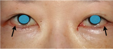灰色で示された上眼瞼ミュラー筋、下眼瞼Lower Retractorの眼球面は眼窩結膜で覆われている。眼窩結膜は上下天蓋部(Fornix)で折り返し、眼球結膜へと移行する。したがって経結膜的下眼瞼形成術で下眼窩内に局所麻酔剤を注入する際、眼球結膜に局所麻酔剤が移行し、図-14の如く眼球結膜が浮腫状となることがしばしばある。