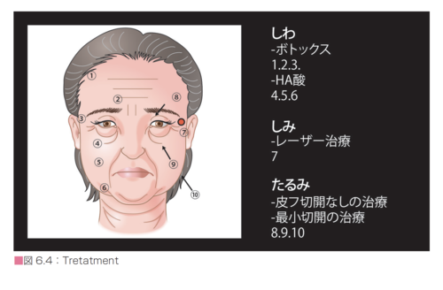 しみの場合には,「Q スイッチYAG(532nm)LASER 照射」が有効である.額,眉間,目尻等の表情じわは,「ボトックス注射」などのスキンケア治療が有効である.目の周囲,ほうれい線,口角のしわは「ヒアルロン酸」が有効であるが,皮下の奥に存在する脂肪塊組織がもたらす皮膚のたるみがこういったしわの原因なので,根本的解決とはならない.目の周囲,頬のたるみは「脂肪塊組織除去」やそのバランス調整により大幅に改善される.